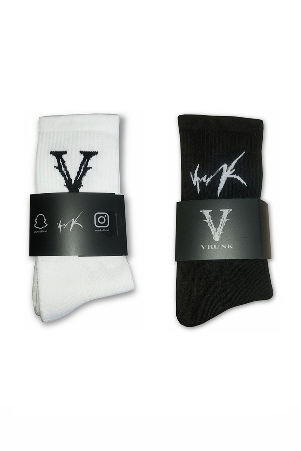 Le pack se compose de 2 paires de chaussettes. Une paire de couleur blanche avec notre logo V au dessus de la cheville et notre logo Signature au niveau des orteils. Et une paire noire avec notre logo Signature au dessus de la cheville et notre logo V au niveau des orteils.